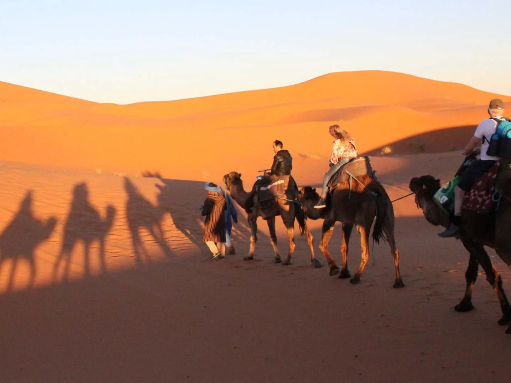 We drive across the Middle Atlas via Ifran, also known as "Moroccan Switzerland," and Azrou after breakfast at your accommodation. You will meet Barbary apes on your visit to the Cedre Gouraud tree in the cedar forest. From here, we traveled south via several villages, where you might have seen nomads residing in tents by the side of the road. Volcanic rocks are also visible. You can have lunch at Midelt, where we'll be stopping next. We then proceed, taking in the expansive vistas as we pass the Tizi N'Talghomt (1907 m). Pass through the Ziz Gorge and the tunnel close to Errachidia to observe the turquoise-blue water of the Barrage Hassan Al-Dakhil. Proceed to Erfoud, where you will pause for a broad perspective of the Ziz River's palm of Aoufous. Arriving at Merzouga and trekking on a camel for approximately one and a half hours to reach the Erg Chebbi dunes, taking in the most breathtaking sunset over the dunes, listening to music and folklore at night in a Saharan desert camp, and spending the night with breakfast and dinner in a Saharan desert Berber tent at the heart of the dunes.
