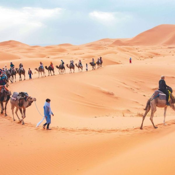 Right after breakfast at your place of accommodation, we drive through the Toudra Valley to the Merzouga desert. We will stop at the Gorges of Dades for some breathtaking views of the vast canyon and then visit the village of Todra. After touring the Todra Gorges, we will reach Erfoud, the city of fossils and dates, where we will have lunch before continuing on to the Merzouga desert. Visit the mausoleum of Moulay Ali Cherif, the founder of the Alaouite Dynasty of Morocco, which is situated on the town's southern boundary, after traversing the village of Rissani. Arriving in Merzouga and trekking on a camel for approximately one and a half hours to reach the Erg Chebbi dunes, taking in the most breathtaking sunset over the dunes, listening to music and folklore at night under the stars in a camp in the Saharan desert, and spending the night with breakfast and dinner in a Berber tent at the base of the dunes.